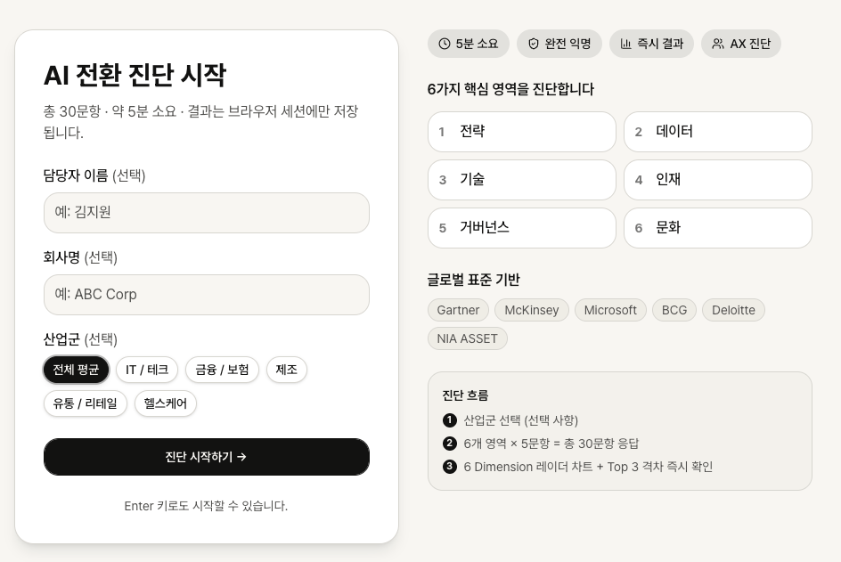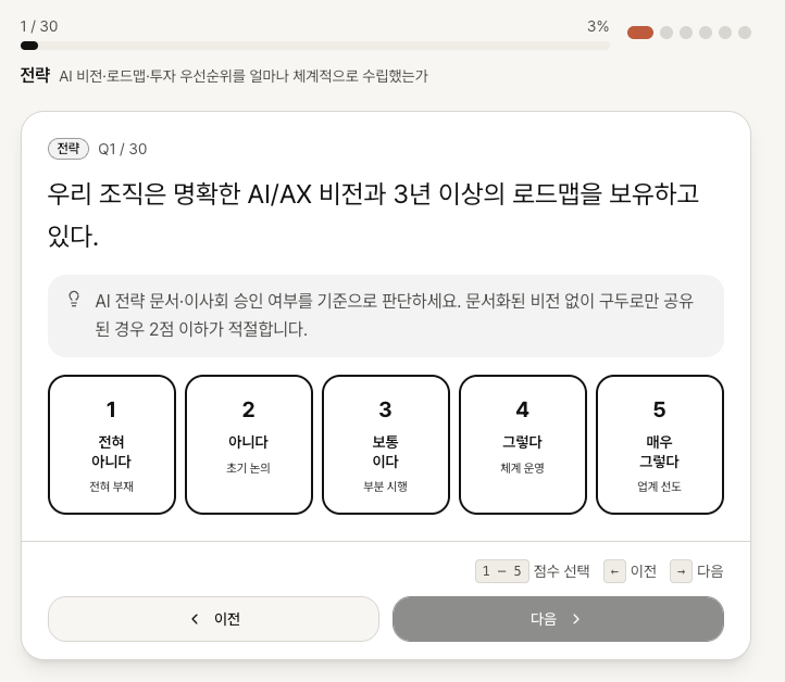 AX Doctor는 조직의 AI 전환 준비 수준을 30문항·5분으로 진단하는 프로그램입니다.