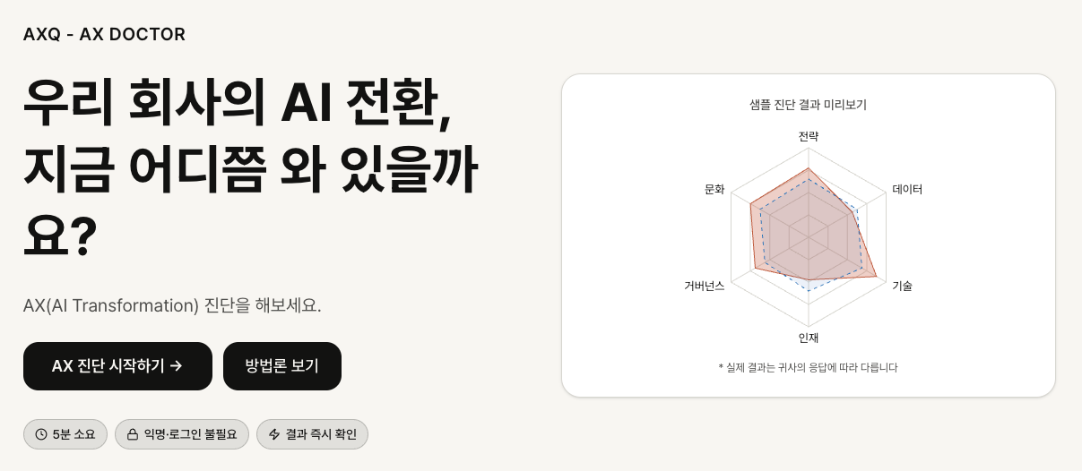 흩어져 있던 접점들을 단일 도메인으로 정리했고, AI 전환 진단 프로그램 AX Doctor by axq.kr 으로 리뉴얼했습니다.