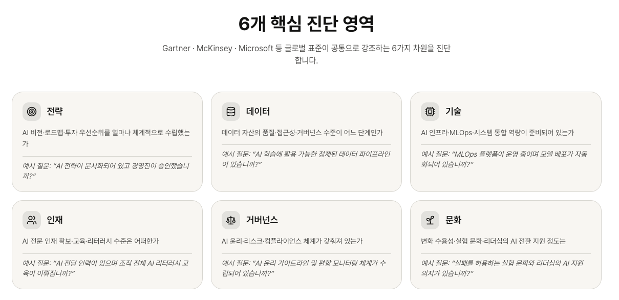 Gartner·Cisco·Microsoft 프레임워크를 기반으로, 전략 정합성부터 문화·변화 관리까지 6개 차원을 측정합니다.
