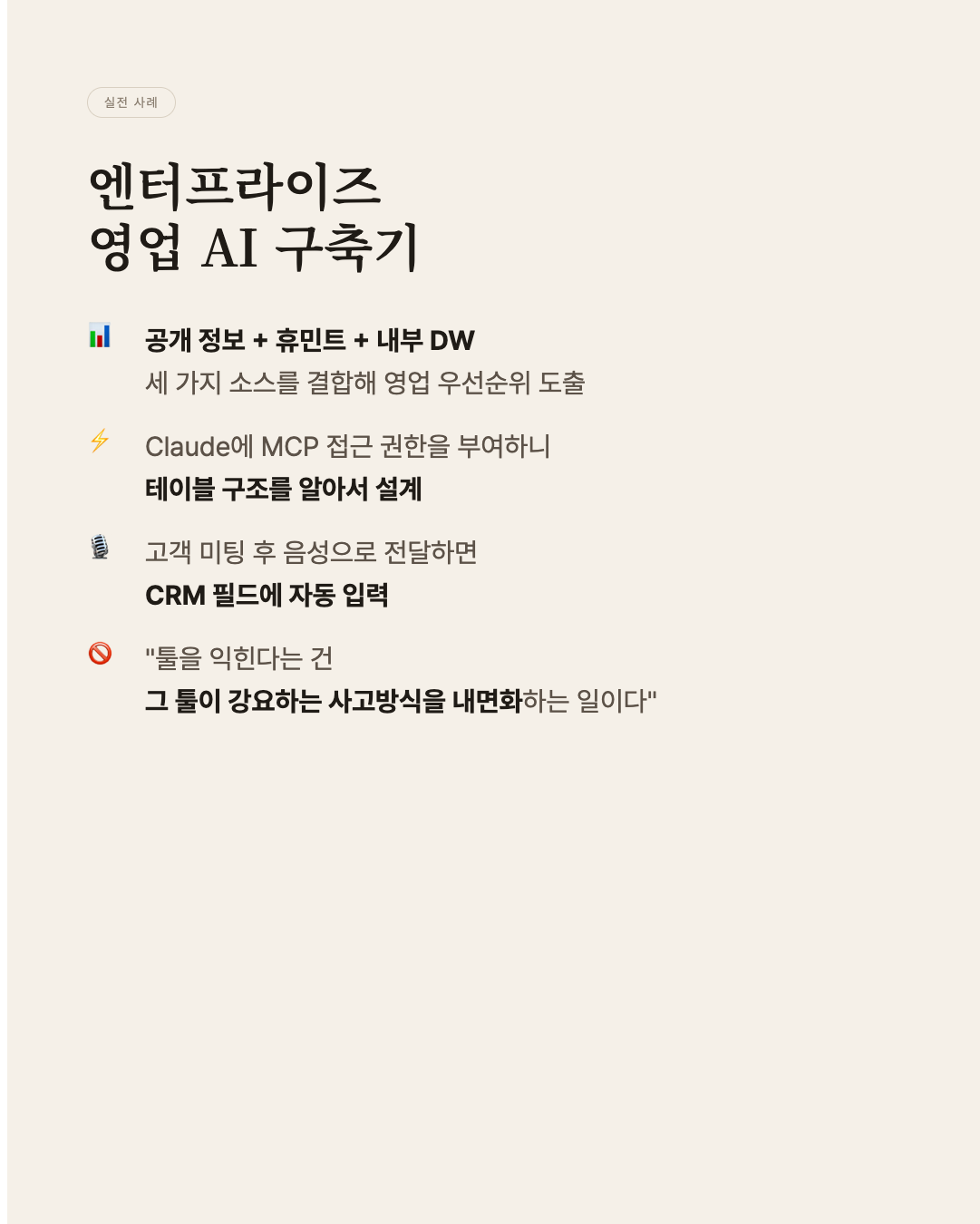 한 기업은 Claude에 MCP 접근 권한을 부여해 테이블 구조를 자동 설계하고, 고객 미팅 후 음성으로 대화 내용을 전달하면 CRM 필드에 자동 입력되는 환경을 만들었다.