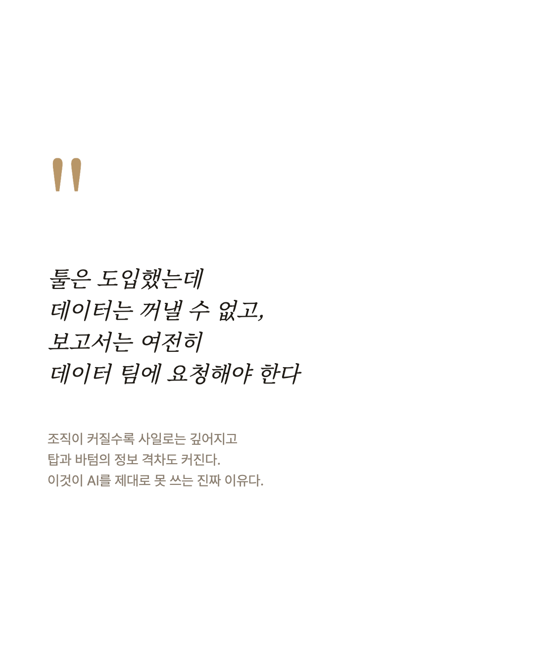 데이터는 솔루션 안에 갇혀 있고, 꺼내려면 데이터 팀에 요청해야 하며, 보고서는 며칠 후에야 돌아온다.