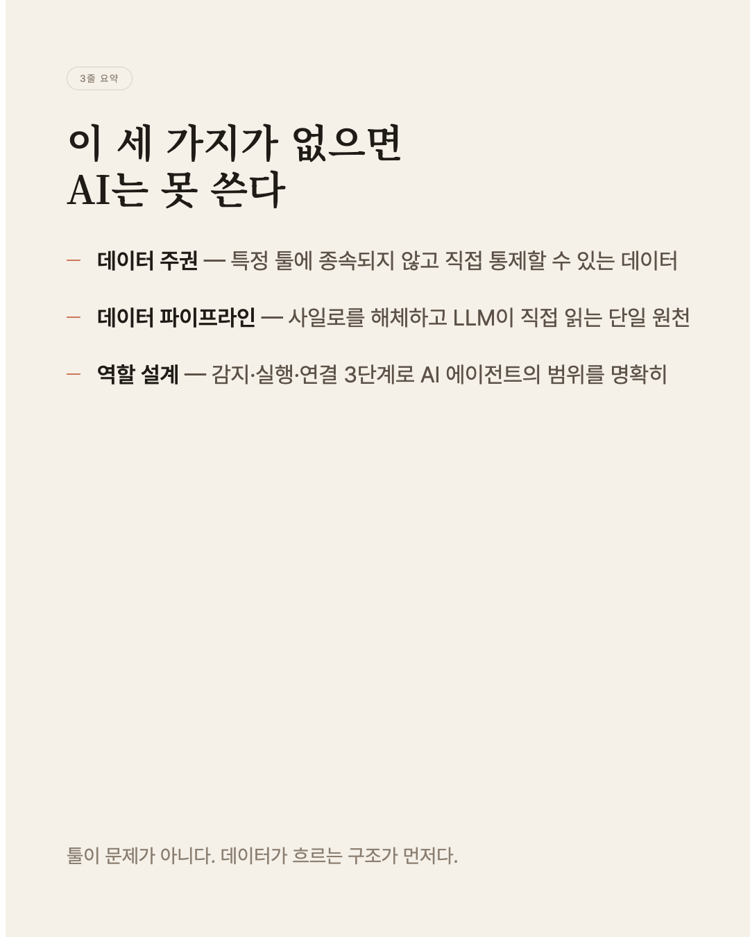 이 세 가지가 없으면 특정 솔루션에 종속된 의존성이 생기고 AI에게 넘길 일 자체를 정의하지 못한다.