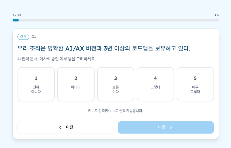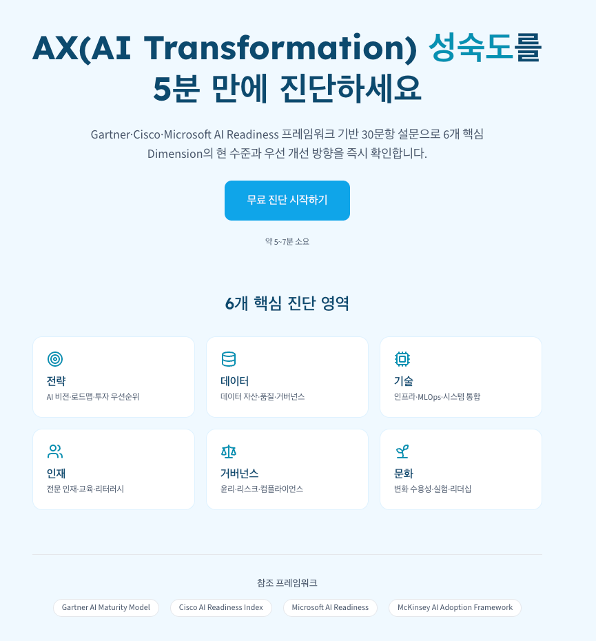 AX(AI Transformation) 성숙도를5분 만에 진단하세요 Gartner·Cisco·Microsoft AI Readiness 프레임워크 기반 30문항 설문으로 6개 핵심 Dimension의 현 수준과 우선 개선 방향을 즉시 확인합니다. 무료 진단 시작하
