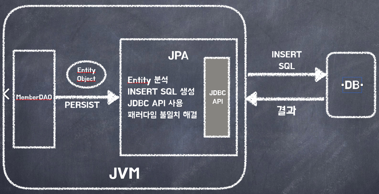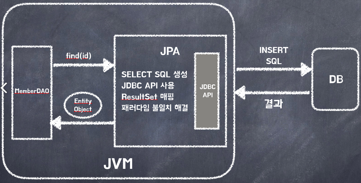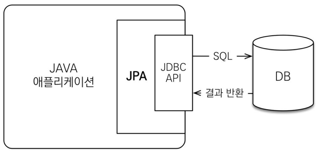 - JPA 는 애플리케이션과 JDBC 사이에서 동작하여 개발자가 JPA 를 사용하면, JPA 내부에서 JDBC API 를 사용하여 SQL 을 호출, DB 와 통신한다.