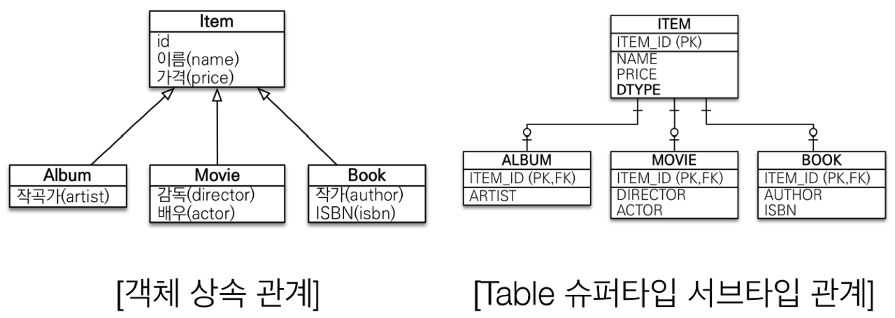 - JAVA에서는 부모클래스와 자식클래스의 관계 즉, 상속관계가 존재하는데 데이터베이스에서는 이러한 객체의 상속관계를 지원하지 않는다. 이런 상속관계를 JPA는 아래와 같은 방식으로 해결하였다.