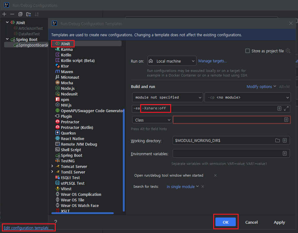 3. (성공!!) Run/Debug Configurations -> Edit configuration template -> JUnit -> VM options -> "-Xshre:off" 추가