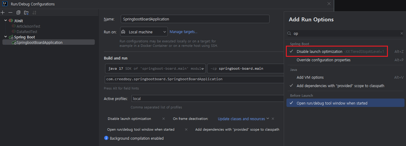 2. (실패) Run/Debug Configurations -> Modify options -> "optimization" 타이핑 검색