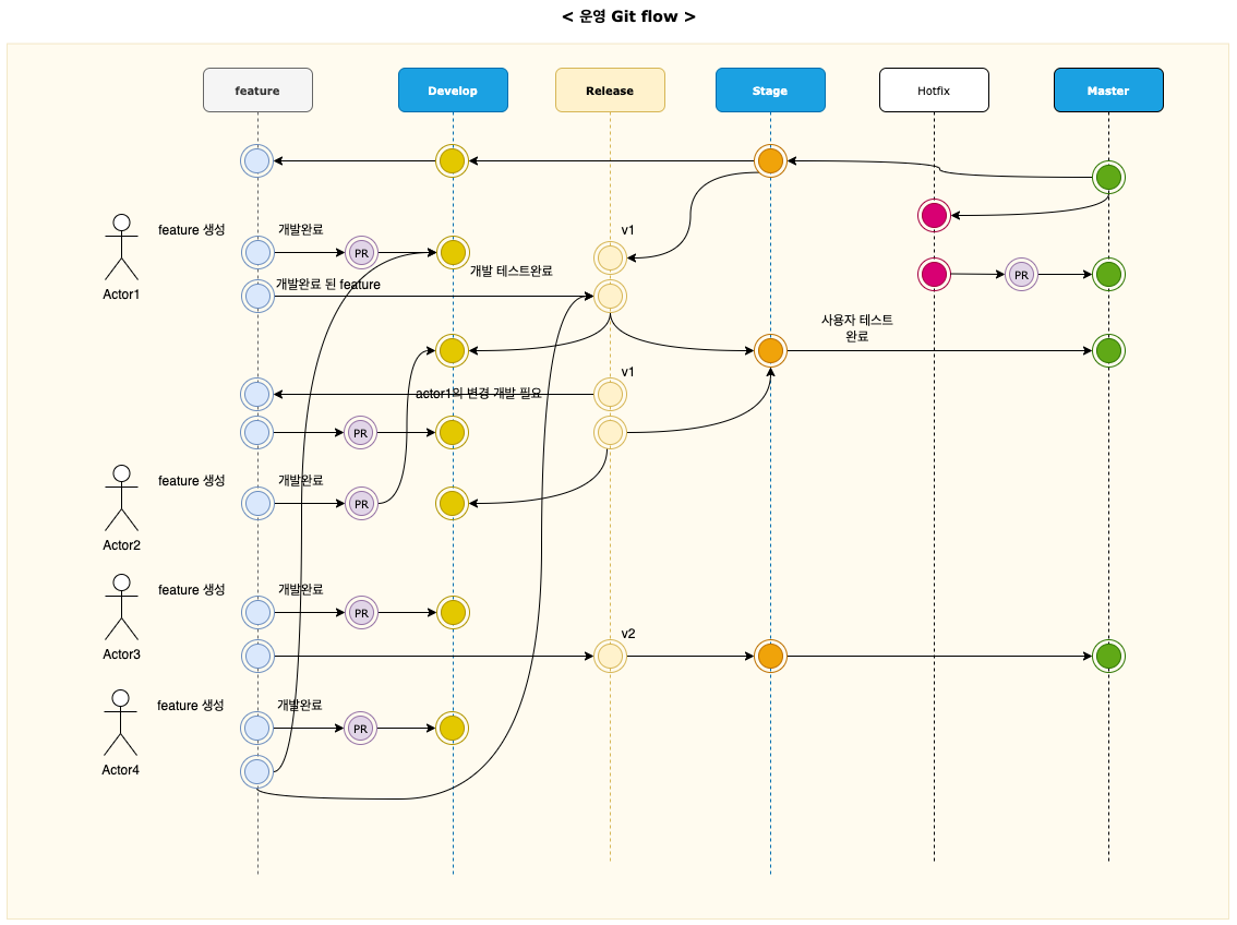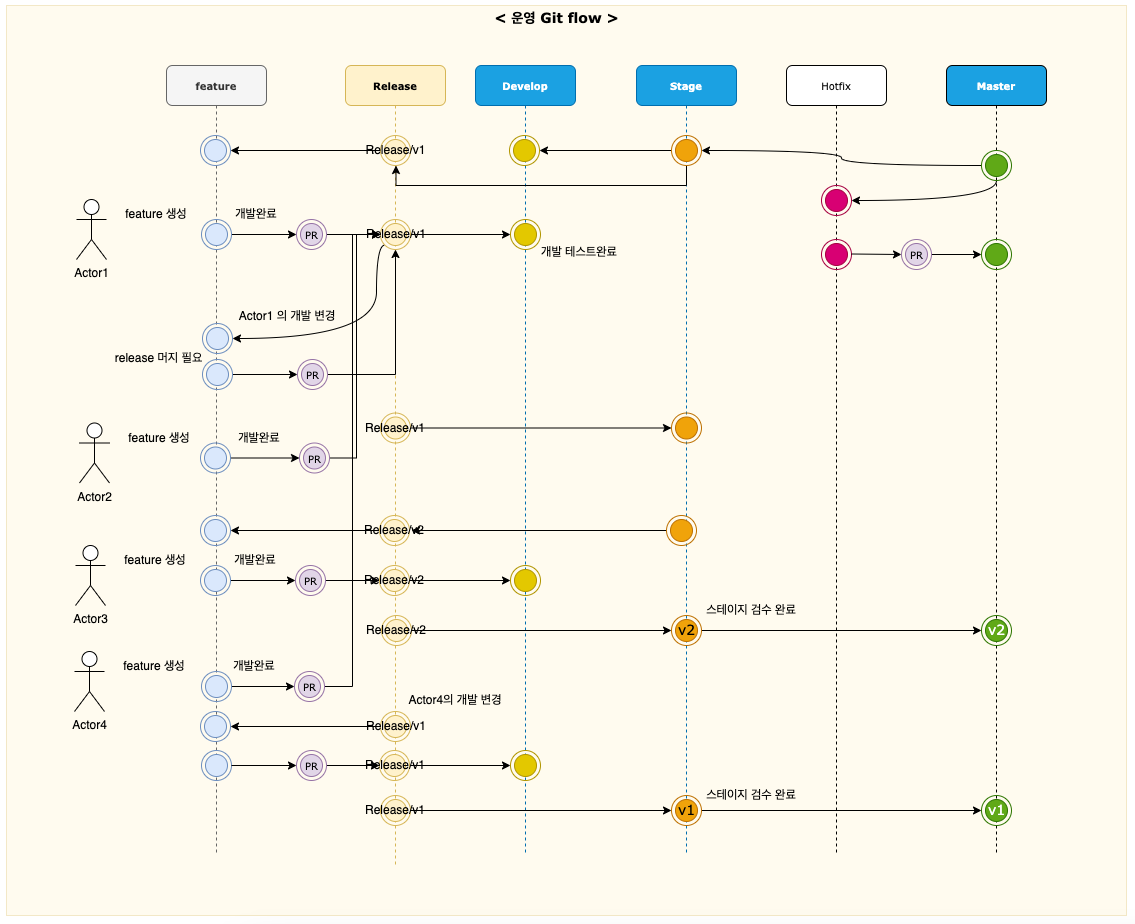 - 일반적인 gitflow 에서는 develop 브랜치가 안정화 되었을때 생성하나, 배포시 브랜치 머지용도로 사용
